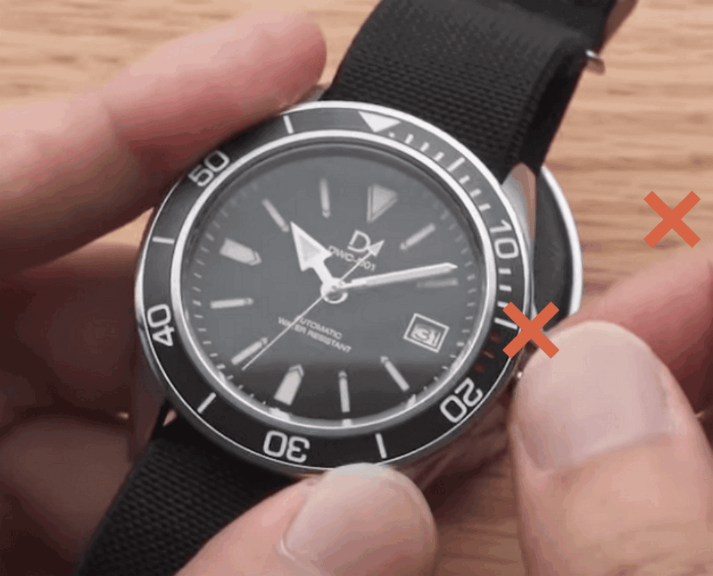 손목에 시계를 찬 상태로 날짜나 시간을 조정하면, 손목의 각도 때문에 크라운(용두)과 스템에 비정상적인 압력이 가해집니다.